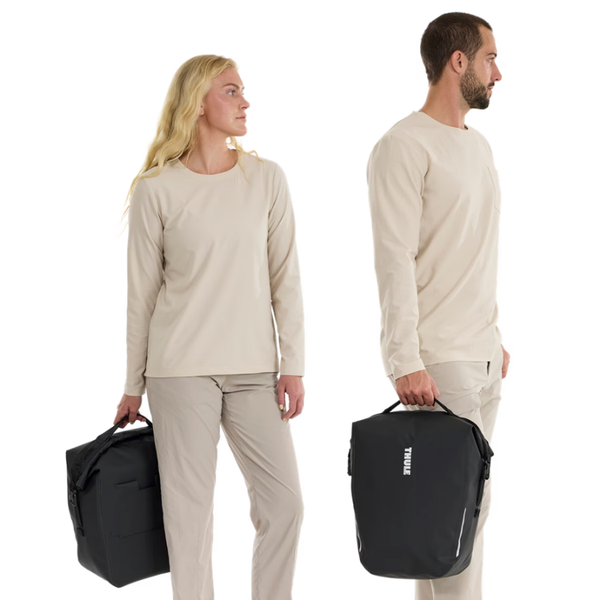 Sacoche à vélo étanche et polyvalente pour les trajets en ville. Le Thule Shield Pannier 22L Rolltop offre un espace de rangement étanche et un design fin sans matériel, ce qui rend le transport agréable même en dehors du vélo. La structure scellée certifiée IPX4 protège tes effets personnels les plus importants, tandis que les détails réfléchissants améliorent la visibilité sur la route. Conçu pour le système Thule InLock pour une fixation sans faille du vélo. Cette sacoche est compatible avec le système Thule InLock (nécessaire pour son utilisation), ce qui permet de l'installer ou de l'enlever en quelques secondes. Il suffit de faire glisser la sacoche sur le cadre de montage, de l'encliqueter et de profiter d'un trajet silencieux. Le détachement du sac est tout aussi simple - il suffit de tirer sur la sangle pour qu'il glisse immédiatement. Fonctionne avec le porte-bagages déjà présent sur ton vélo ou s'intègre parfaitement à chaque génération du Thule Tour Rack.